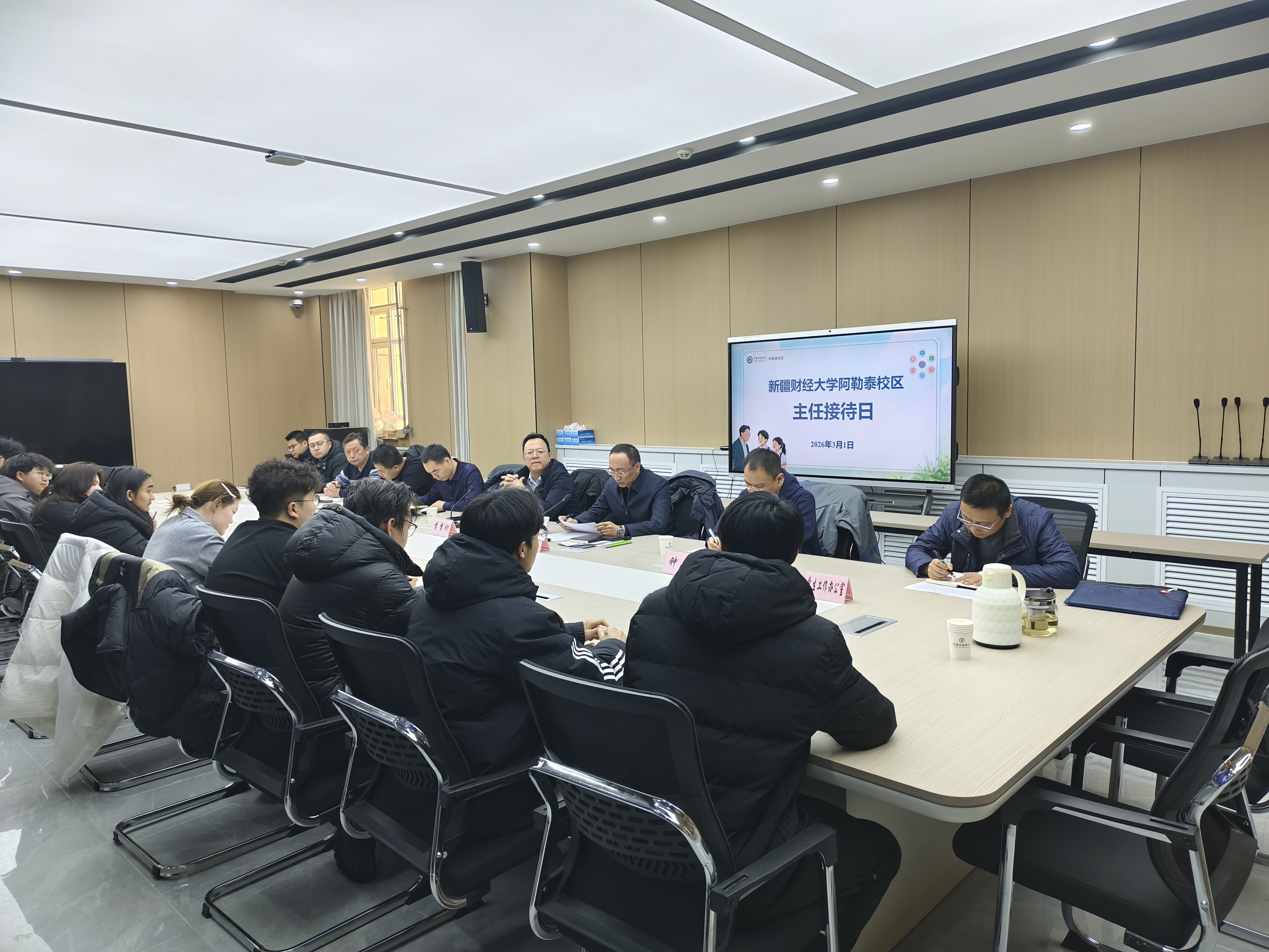 2026年3月1日,新疆财经大学阿勒泰校区在综合教学楼213会议室组织召开了2026年春季学期第一次主任接待日活动。校党委常委、副校长,阿勒泰校区管委会书记、主任李季刚以及阿勒泰校区管委会相关科室负责同志共同参加本次活动,与各班学生代表面对面交流,倾听学生心声。