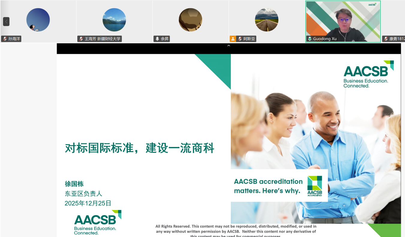 为推进学院AACSB国际认证工作,12月25日学院邀请AACSB国际(The Association to Advance Collegiate Schools of Business)东亚区负责人,徐国栋先生(Guodong Xu, Regional Head, East Asia),进行AACSB国际认证专题在线培训。徐国栋先生是AACSB认证领域的资深专家,长期负责亚太地区商学院的认证评审与指导工作,对认证标准、流程、评审重点及常见问题有着深刻的理解和丰富的实战经验。学院全体教师参加了本次学习培训。